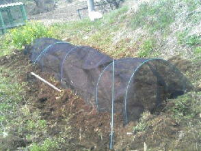 に小松菜などを蒔き、霜よけに寒冷紗で囲いましたトマトなどの苗を作るため箱に種蒔きして、