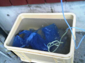 は、漬物桶なかで水に浸しておきます。底からエアーポンプで空気を送り、ぶくぶくさせておき