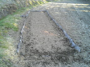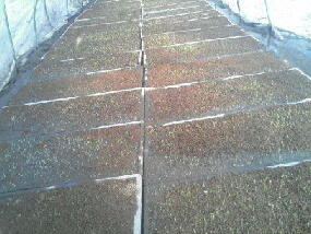 種蒔き後、覆土した箱を苗床に並べていきます。トンネル支柱を立て寒冷紗をかけます。保