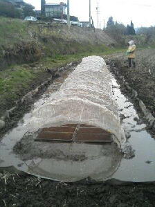 たんぼの一角を畦シートで囲いました。畦シートは前後に倒れないようにピンと張らずに波立