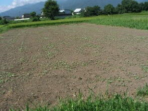種蒔き後は時々畦の草刈りをするだけでほったらかしです。種蒔きのときの多少の斑はあっ