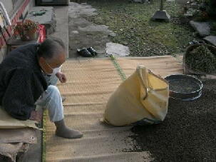 いのを使ってふるい、ござの上に落とします。ふるうことにより茎や石などを取り除きます。90