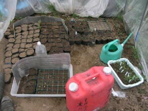 ところにおいておきました。インゲン、ズッキーニなどは直接ポットに播いたので、ミニハウスに