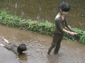 ちの苗を植えました。子どもの体験スペースと最低限(自家用のもち米)を確保できればという ことでやってみました。子どもに植えてもらう予定でしたが、泥遊びとなってしまい親が全て手植 えで植えました。大騒ぎの田植えとなりました。